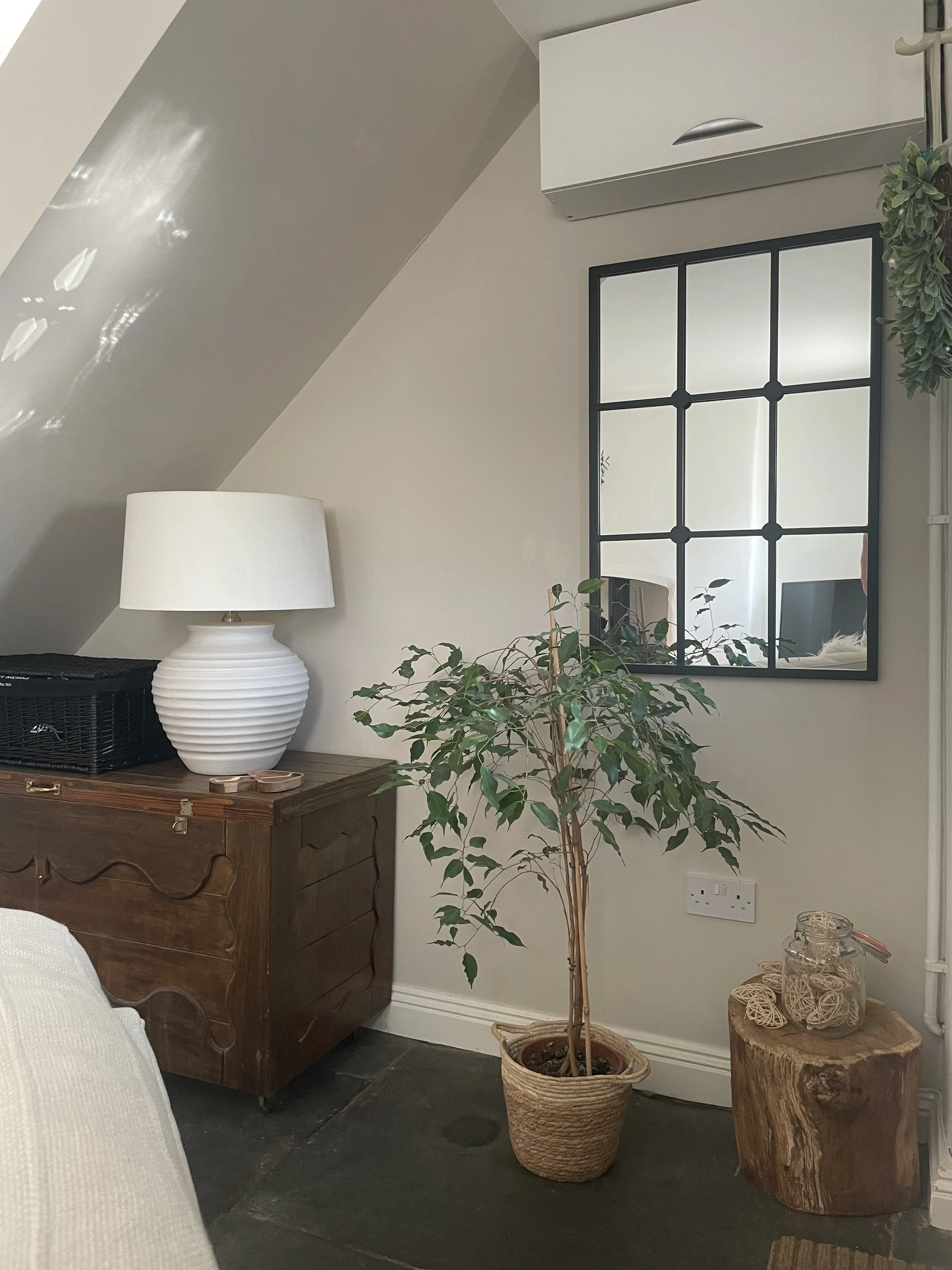 A cozy corner of a room with a wooden chest, white-ribbed table lamp, green potted plant in a woven basket, decorative glass jars, a wall mirror with black grid frame, and part of a beige sofa.